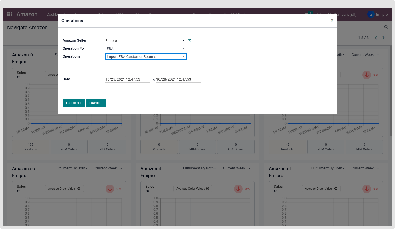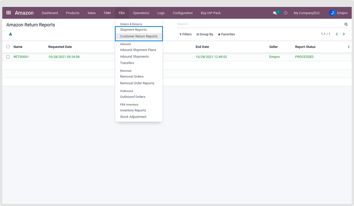 - This feature is used to Import FBA Customer Returns from Seller Central and process those Return Reports in Odoo.