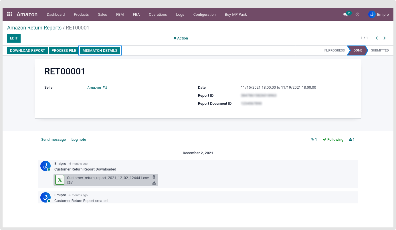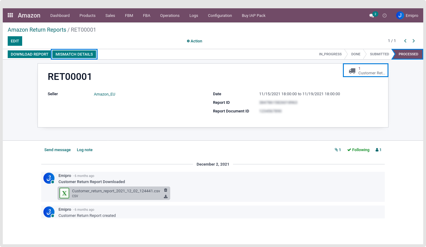 After Successfully processing the Return report, The user can see return stock moves. Now, the user will be able to see two buttons Reprocess file and Mismatch details.
