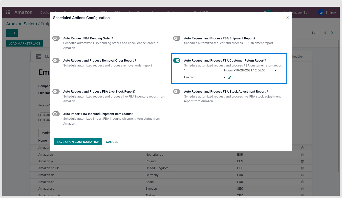 - The user can Configure a Scheduler that will Request, download, and process Customer Return Reports automatically from Amazon FBA.