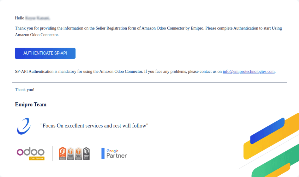After clicking on the button SP-API Re-Authorisation You will receive an email with an authentication link that helps you to redirect to Amazon Seller Central and re-authenticate your seller account. This link will expire in 1 hour.